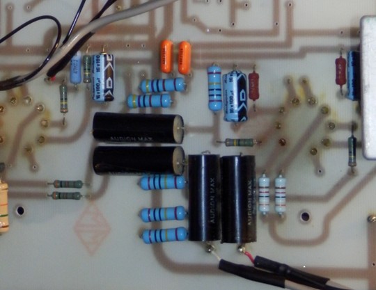 La componentistica è standard , nulla di particolare ad eccezione dei condensatori plastici in contenitore di alluminio...pregevoli. I condensatori di accoppiamento sono marchiati AUDION , ma sono componenti comuni , di qualità accettabile , ma sono MKT ... e qui preferirei altri componenti .