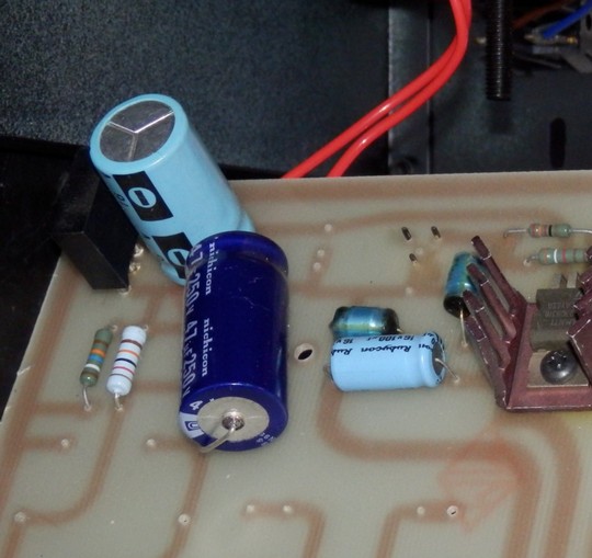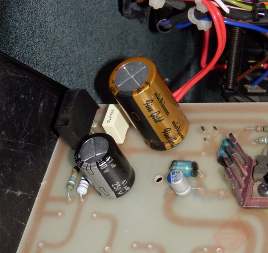 In questa sezione del alimentazione ho sostituito i vecchi condensatori con componenti più recenti e performanti , si può osservare l' ottimo Nichicon "fine Gold" a cui ho affiancato un plastico da 0,22 uF che non c'era in origine, il Panasonic 105° e il condensatore polimerico Kemet :
