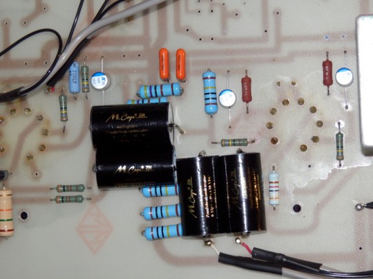 Invece per i condensatori di accoppiamento al posto degli MKT originali ho voluto usare i Mundorf Mcap ZN : sono polipropilene e FOGLIO di stagno (non volgare polipropilene metallizzato) ... Io con questi condensatori mi sono trovato bene , anzi benissimo !!