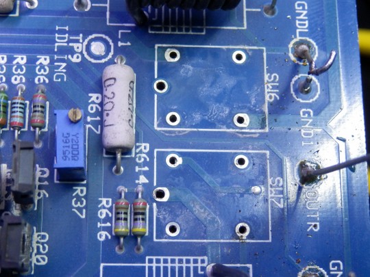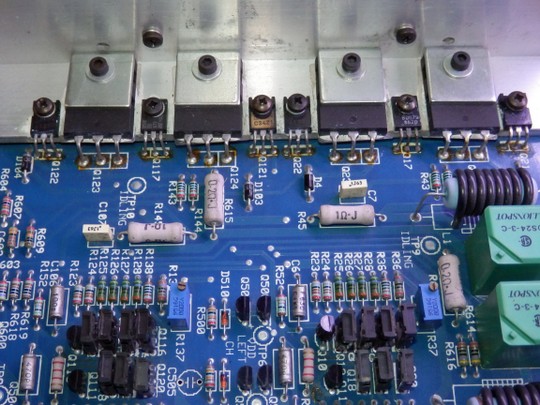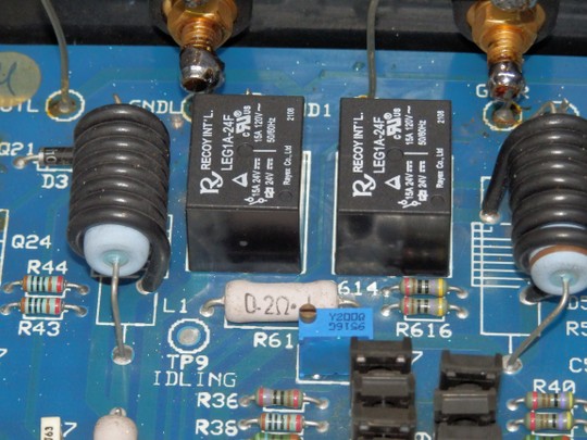Nell'immagine a fianco, è possibile osservare i nuovi relè di uscita selezionati per l'amplificatore. Questi relè sono stati scelti per garantire una maggiore capacità di sopportare corrente rispetto ai componenti originali. Si tratta di un'aggiunta eccellente che contribuisce a migliorare l'aspetto complessivo dell'amplificatore.