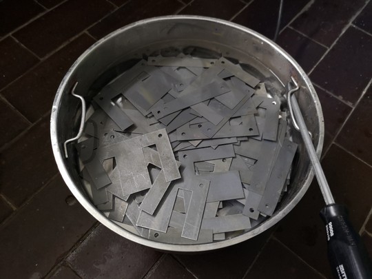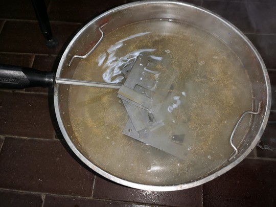 Una volta recuperati tutti i lamierini si è proceduto con un lavaggio con soda caustica portata a temperatura . Successivamente sono stati tolti e risciaquati e sempre tramite bollitura,ritrattati, ma con semplice acqua demineralizzata .